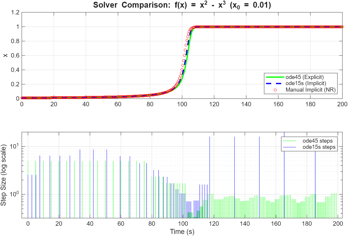legend({'ode45 (Explicit)', 'ode15s (Implicit)', 'Manual Implicit (NR)'}, 'Location', 'southeast');
